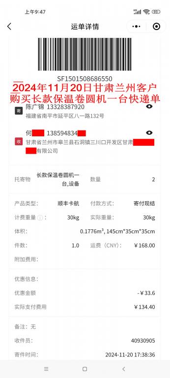 第三次購買12月24日濟(jì)寧客戶快遞單